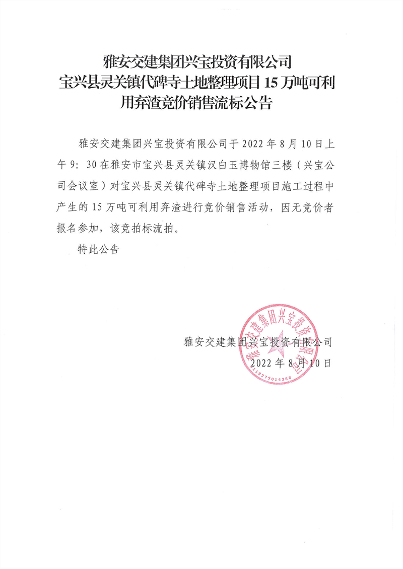 雅安交建集團(tuán)興寶投資有限公司靈關(guān)鎮(zhèn)代碑寺土地整理項(xiàng)目15萬(wàn)噸可利用棄渣競(jìng)價(jià)銷(xiāo)售流標(biāo)公告