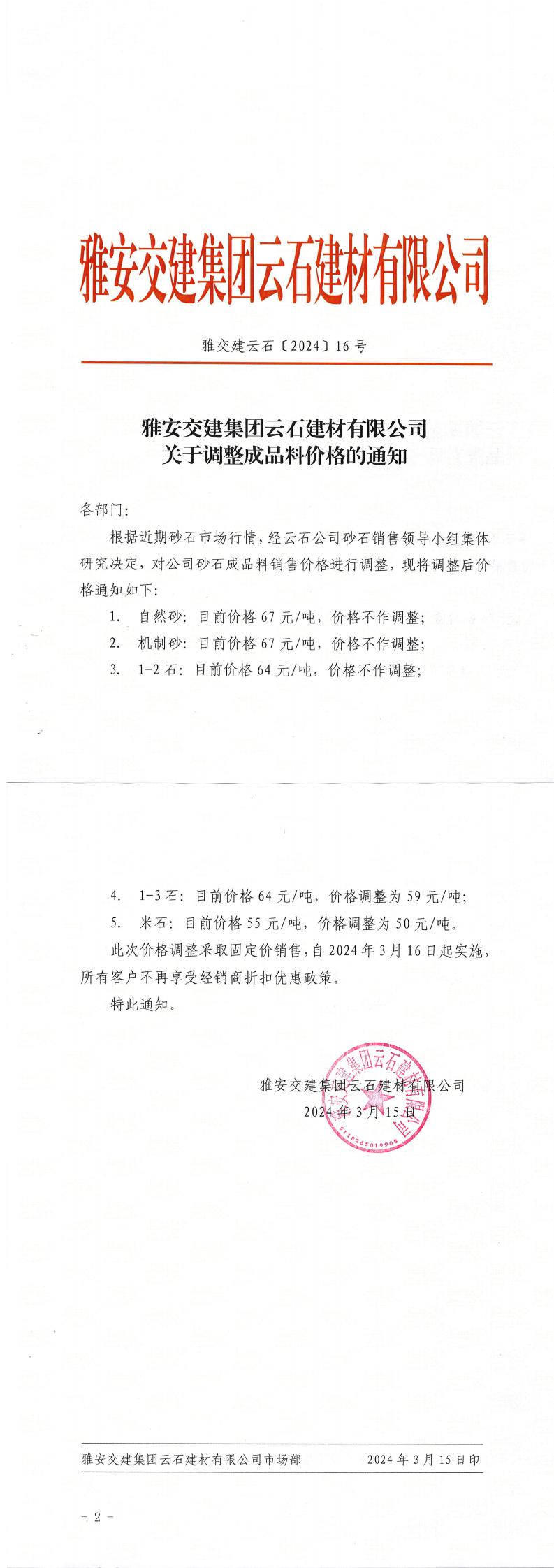 ÑŰ²½»½¨¼¯ˆFÔÆÊ¯½¨²ÄÓÐÏÞ¹«Ë¾³ÉÆ·Áσr¸ñÕ{Õû¹«¸æ£¨2024-2-21£©